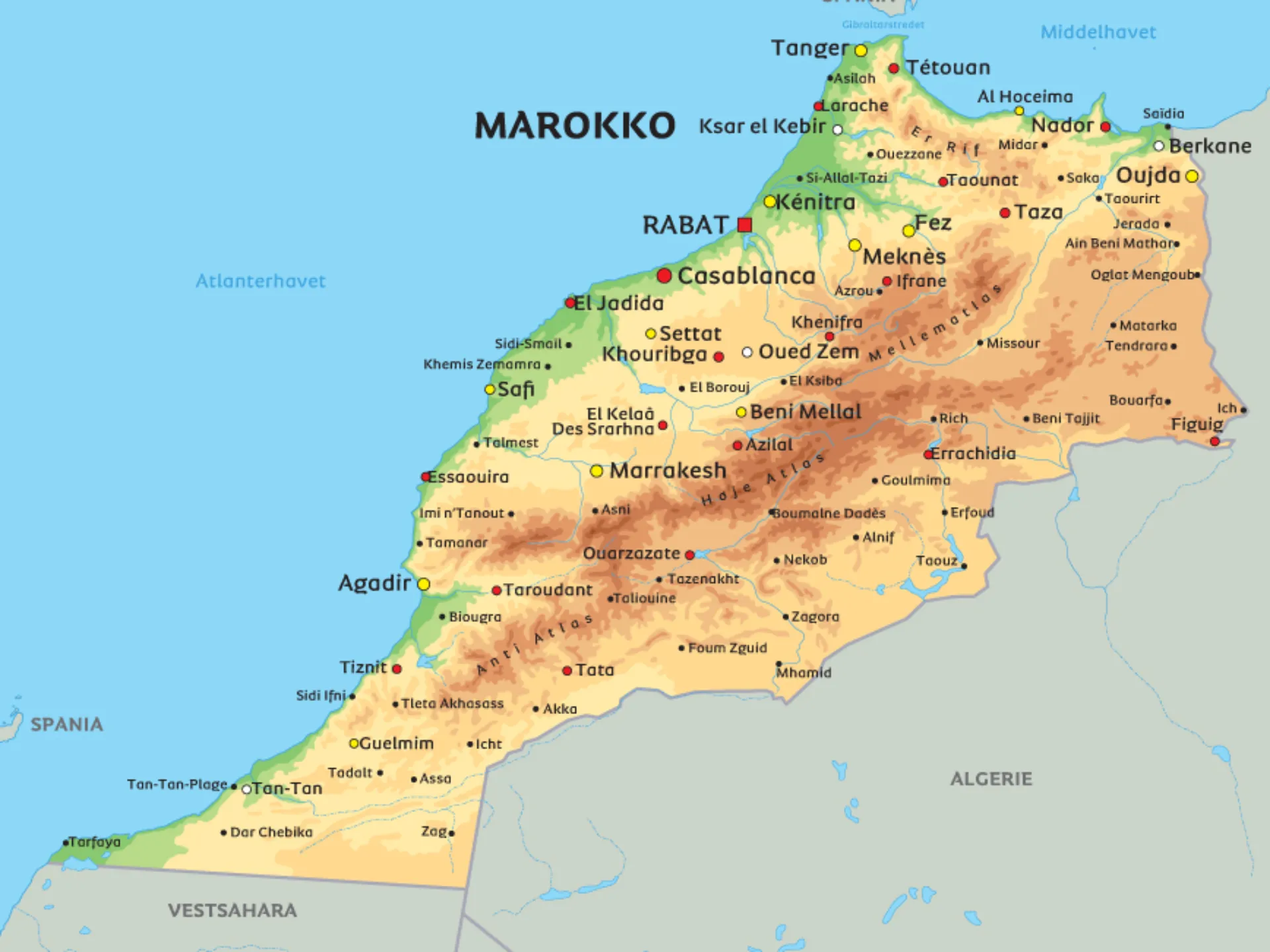Her finner du et kart over Marokko. Se for eksempel Casablanca, Rabat eller Marrakech.