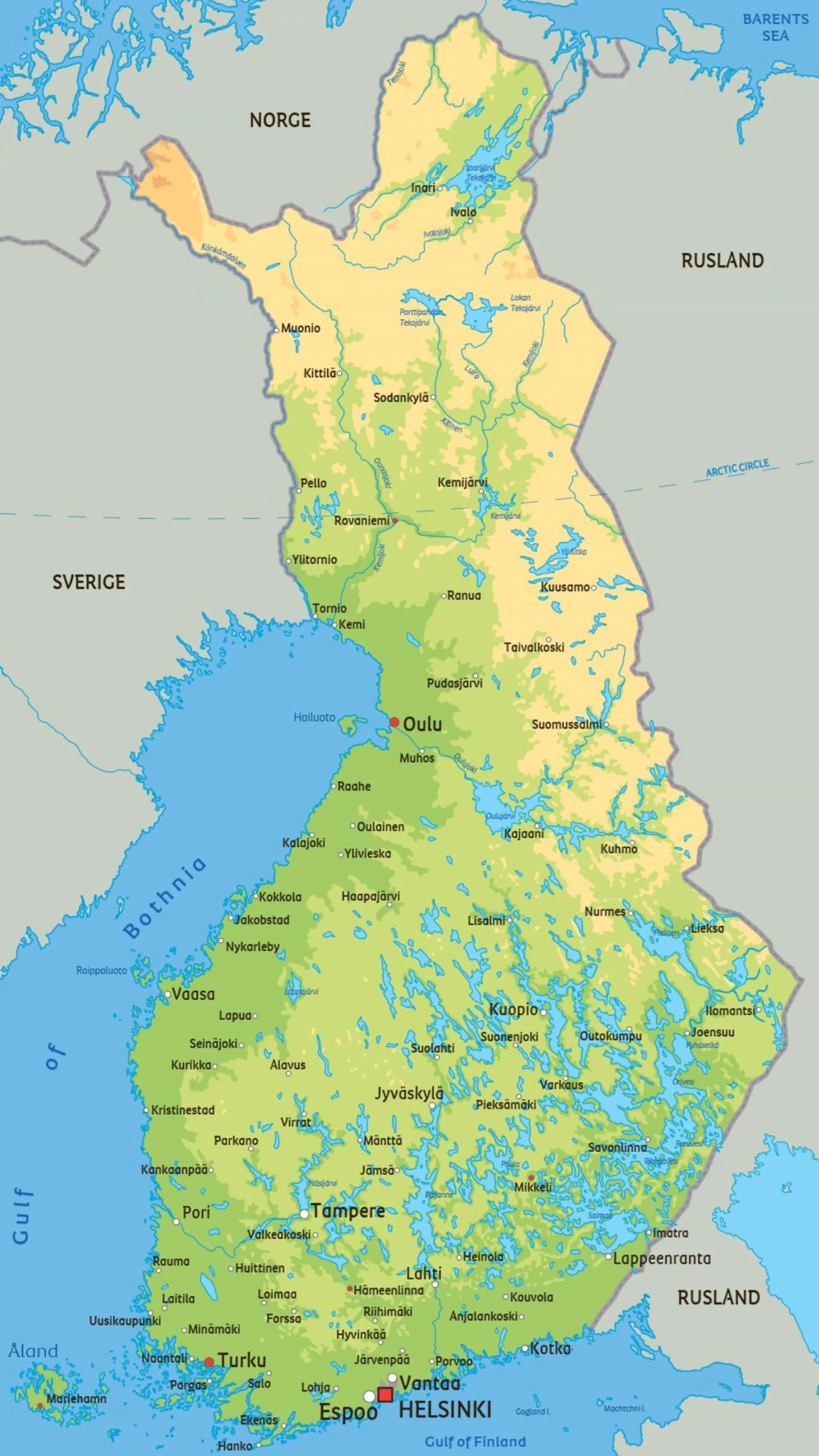 Nedenfor finner du et kart over Finland. Se blant annet plasseringen av hovedstaden Helsingfors og Turku, som ligger langs den finske kysten. Lenger inne i landet kan du finne byer som Tampere eller Oulu, som er omgitt av vakre naturopplevelser. I den nordlige delen av landet, over polarsirkelen, finner du byen Rovaniemi, som er den største byen i Lappland-regionen. Så hvor finner du hovedstaden Helsingfors (Helsinki)? Finn den på kartet.