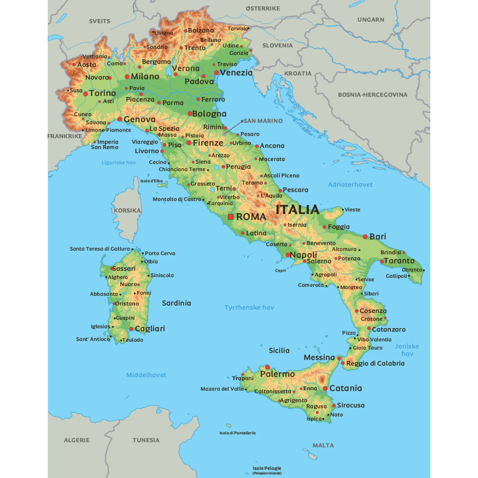 Her finner du kart over Italia. Se blant annet plasseringen av hovedstaden Roma og andre fantastiske italienske byer.