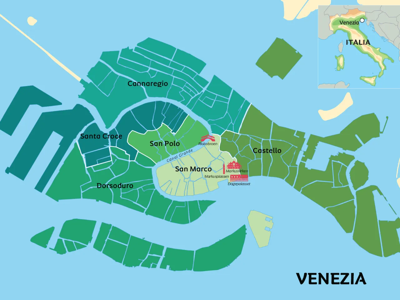 Her ser du et kart over Venezia med flere av byens severdigheter. Finn blant annet Markuskirken og Dogepalasset, som ligger ved Markusplassen. Besøk den store kanalen, Canal Grande, som snor seg gjennom Venezia, og den berømte stenbroen Rialtobroen, som krysser kanalen. Kartet er din guide gjennom byen. Hvor finner du Markusplassen? Det kan du se på kartet.