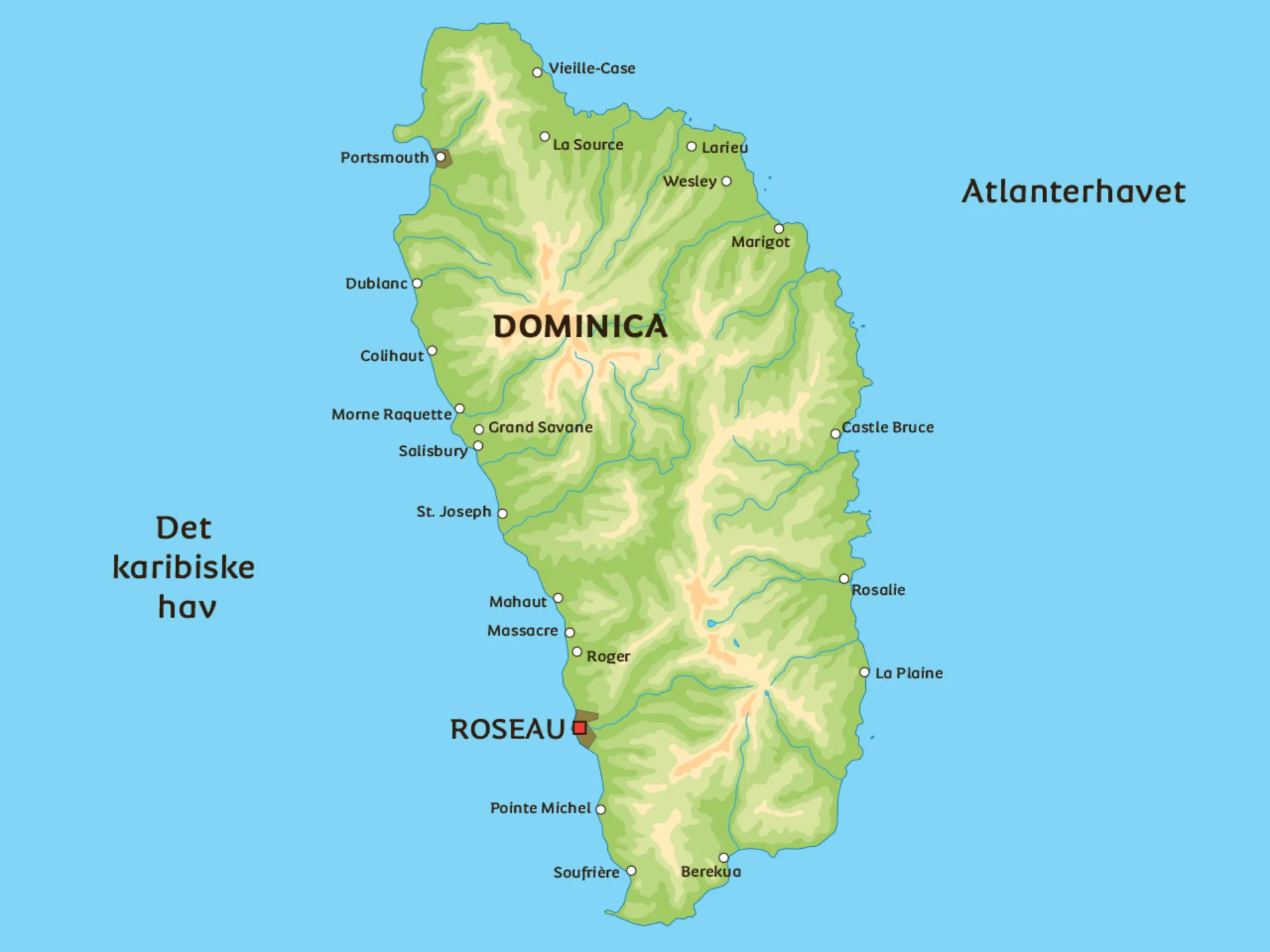 Nedenfor er et kart over Dominica. Du kan begynne å utforske øya her og for eksempel gjøre deg kjent med hovedstaden Roseau.