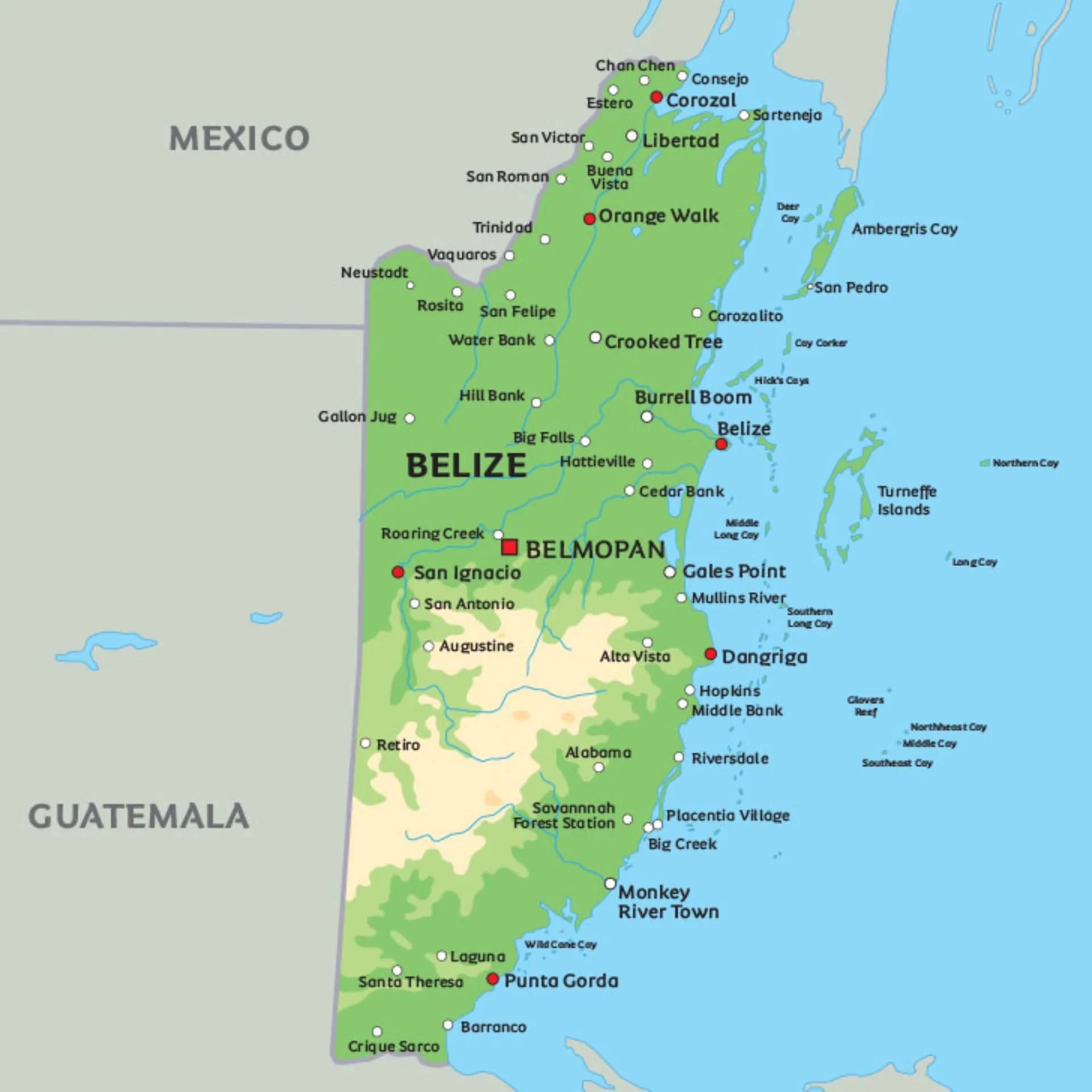 Her kan du se et kart over Belize. Se blant annet hvor hovedstaden Belmopan og Belize City ligger.