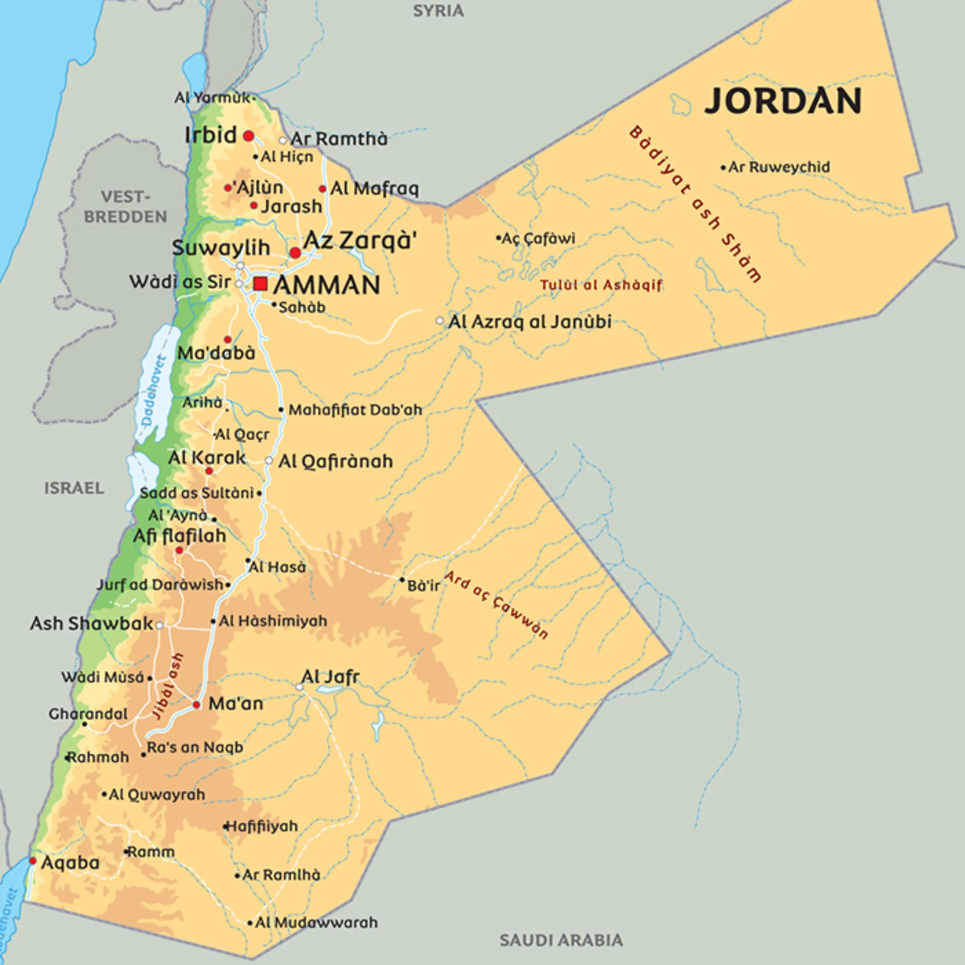 Nedenfor finner du et kart over Jordan. Se blant annet Jordan-elva og beliggenheten for den spennende oldtidsbyen Petra.