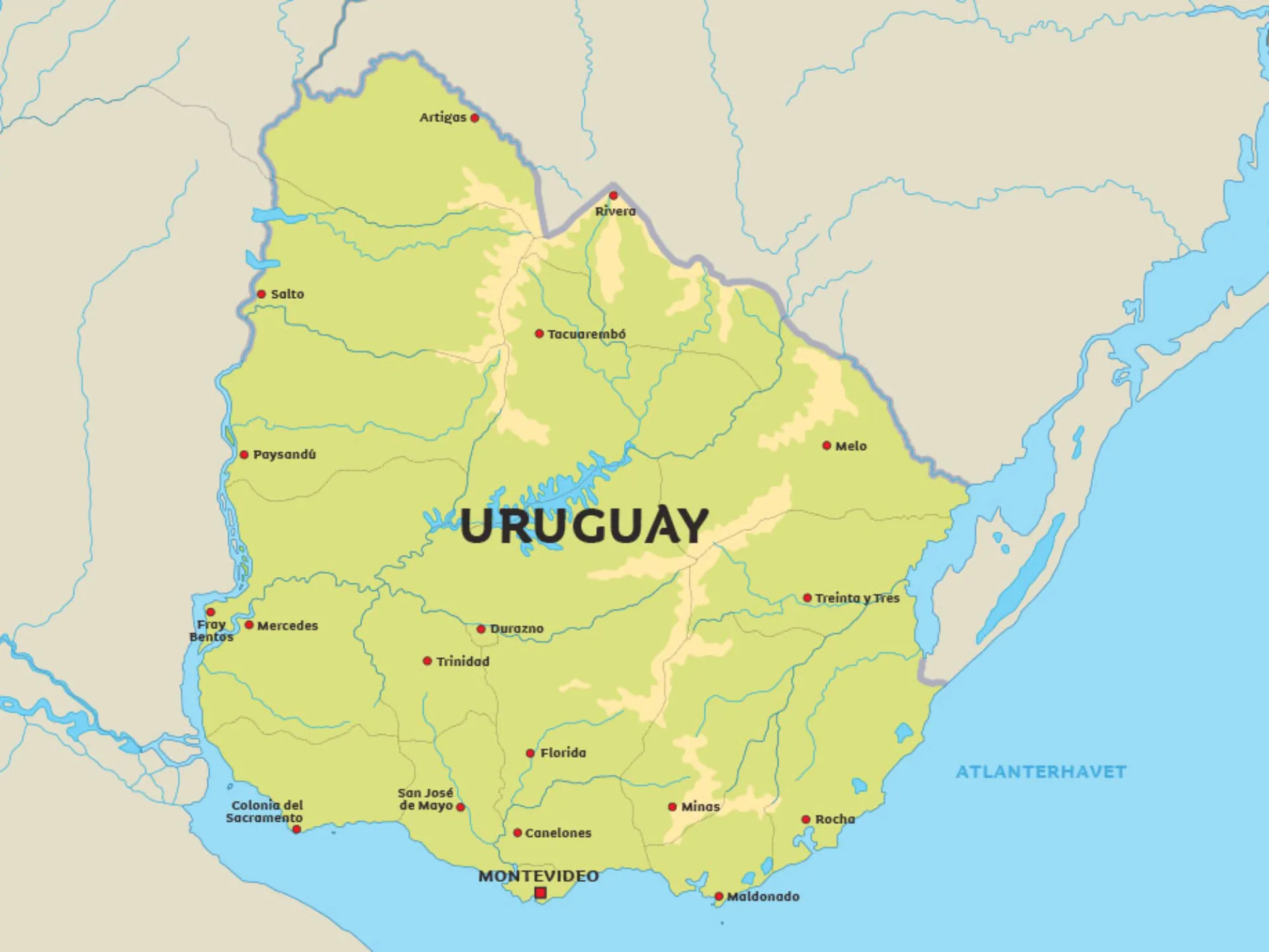 Nedenfor kan du se et kart over Uruguay. Se blant annet hvor hovedstaden Montevideo ligger.